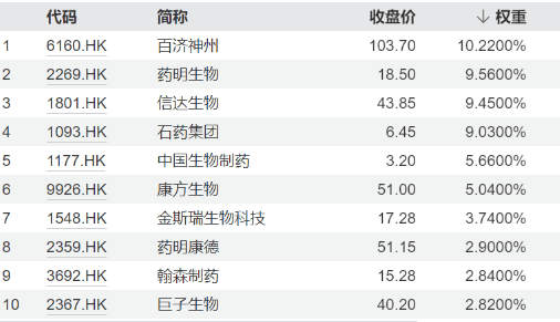 公开数据显示,百济神州目前为恒生生物科技ETF(513280)标的指数(恒生生物科技指数)第一大重仓股,占比超过10%,信达生物、石药集团占比超8%,中国生物制药占比超5%,康方生物占比超4%,金斯瑞生物科技占比超3%,药明康德、康哲药业、京东健康、瀚森制药、巨子生物、再鼎医药、国药控股、和黄医药占比均超过2%