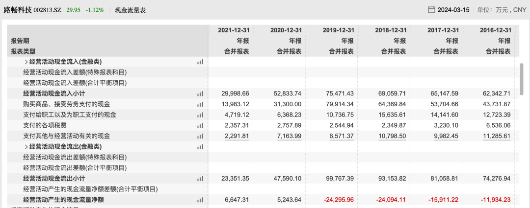 此外,值得注意的是,路畅科技经营活动产生的现金流十分不稳定。2016年-2019年连续4年,累计流出7.62亿元,2020年-2022年虽然回正,2023年再度净流出1557.21万元。