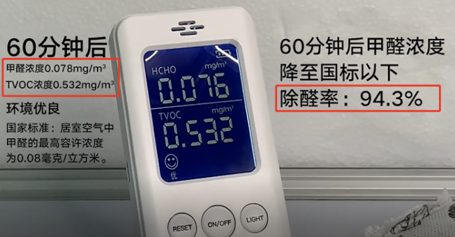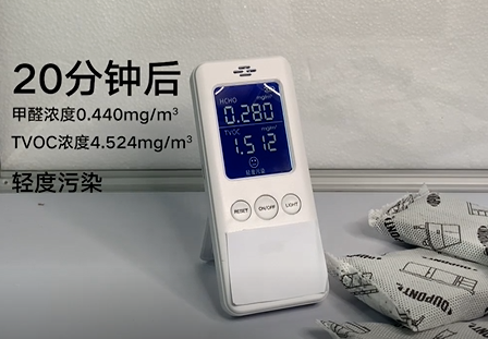过了20分钟,甲醛就降到了0.44mg/m³。