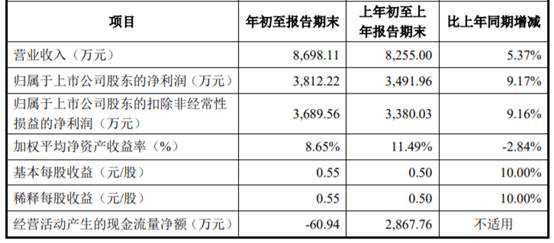 公司2022年第一季度(未经审计)营业收入为8698.11万元,较上年同期增长5.37%;归属于上市公司股东净利润为3812.22万元,较上年同期增长9.17%;扣除非经常性损益后的归属于上市公司股东净利润为3689.56万元,较上年同期增长9.16%;经营活动产生的现金流量净额为-60.94万元,上年同期为2867.76万元。