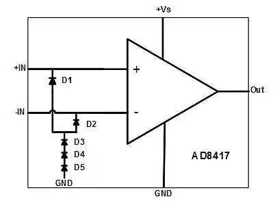 图1显示了在输入引脚和电源之间连接有二极管的放大器示例。二极管在正常工作条件下反向偏置,但当输入上升到高于正电源电压或低于负电源电压时变为正向偏置。当二极管正向偏置时,电流会通过放大器的输入流到相应的电源。