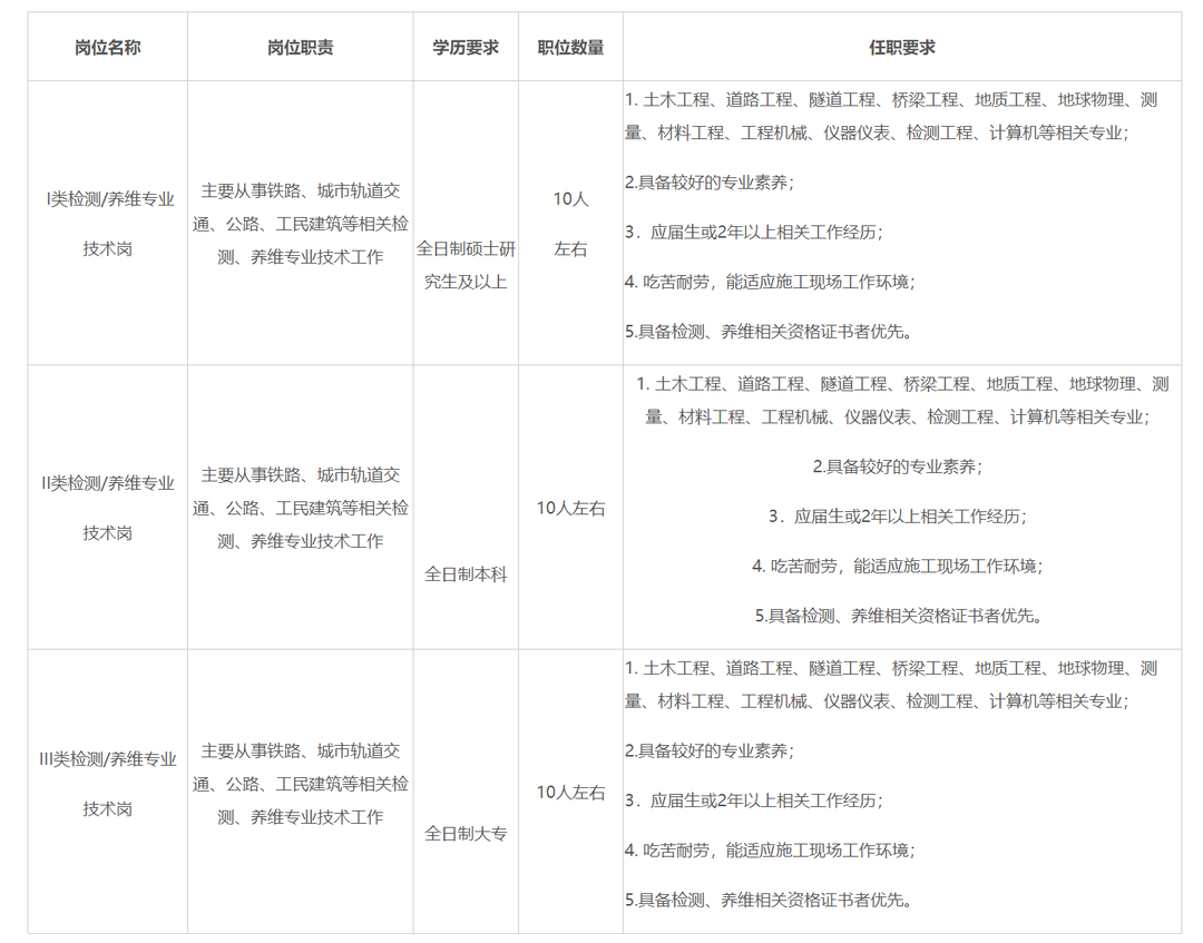 因公司发展需要,现公开招聘检测、养维相关技术人员,招聘总人数为30人左右。