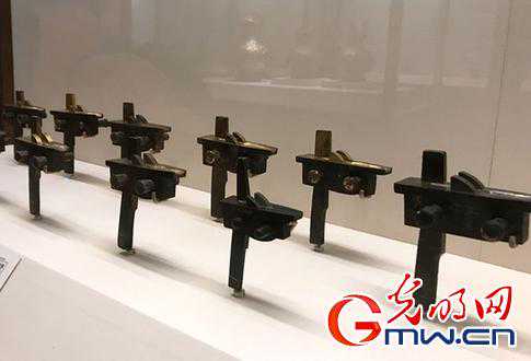 铜弩机——在刘胜的墓甬道、南耳室、中室和后室内,一共出土了实用弩机16把。弩机由郭、悬刀、钩心、牙、键等部分组成。弩是在弓的基础上发明建造的,有弩臂、弩弓和弩机构成,弩臂前端安装安弓,后端装铜弩机。在弩臂和弩机的作用下,无须在张弦的同时瞄准,命中率得以提高,且射程也比弓远。