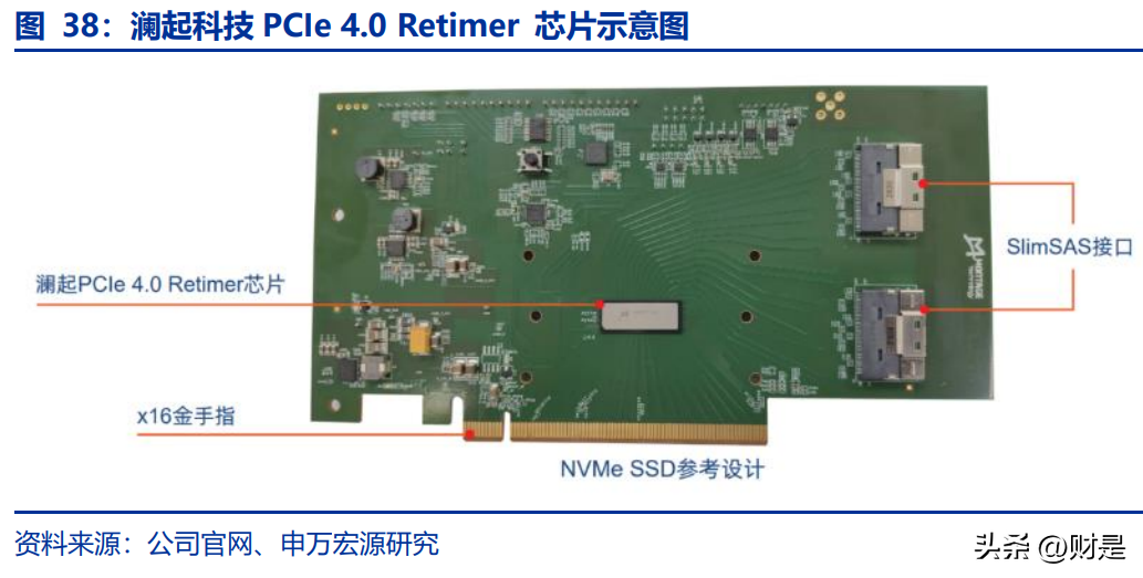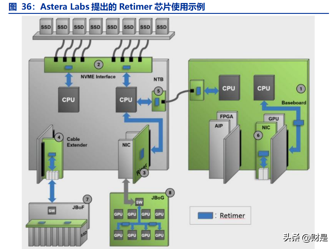②保证服务器CPU与NVMeSSD稳定互联:该应用主要集中于存储服务器领域。为了实现多盘位NVMeSSD配置,存储服务器的系统拓扑结构通常都会包含PCIe扩展卡。对于Gen3标准的NVMeSSD,全系统最多能支持12个NVMeSSD。而Gen4标准的NVMeSSD可以提供最高8GB/s的频宽,是Gen3的两倍。一方面随着应用不断发展推动着PCIe标准迭代更新,速度不断翻倍,另一方面由于服务器的物理尺寸受限于工业标准并没有很大的变化,导致整个链路的插损预算从时代的22dB增加到了时代的28dB,并进一步增长到了时代的36dB。如何解决PCIe信号链路的插损问题,提高PCIe信号传输距离是业界面临的重要问题,这使得PCIeRetimer芯片有广阔的用武之地。
