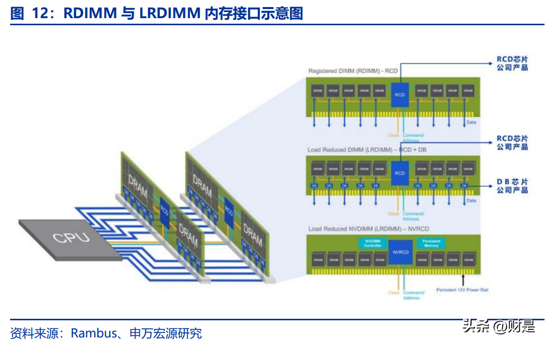 根据插槽结构类型不同,内存条主要分为以下四种类型:RDIMM、LRDIMM、UDIMM和SODIMM。按照应用领域不同,其可以分为服务器内存模组、普通台式机与笔记本内存模组。其中RDIMM和LRDIMM主要在服务器使用,并需要内存接口芯片与配套芯片;UDIMM和SODIMM主要在PC使用,UDIMM少量应用于低端服务器,两者均不需要内存接口芯片,但需要配套芯片。①RDIMM(寄存式双列直插内存模组):全称RegisteredDIMM(RegisteredDualIn-lineMemoryModule)。RDIMM在CPU和内存条间增加一个寄存时钟驱动器(RegisteredClockDriver,RCD)进行转发,既减少了并行传输的距离,又保证并行传输的有效性。目前RDIMM是较为主流的服务器内存条,单条容量可达到128GB,频率较高,价格低于LRDIMM。在内存接口芯片上,使用一个RCD不使用DB。