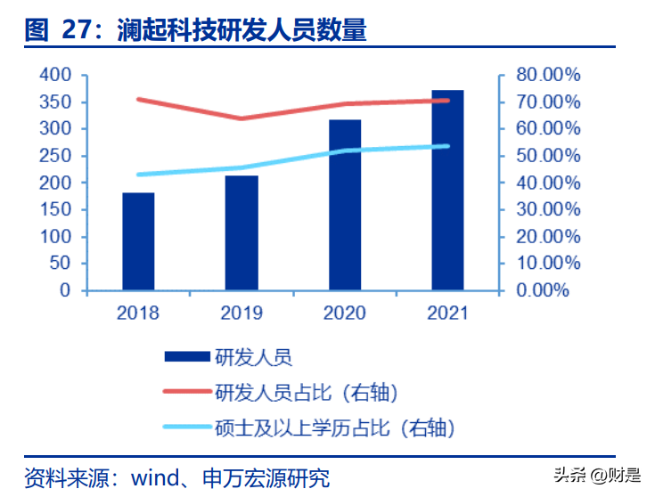 为了保持公司技术的前瞻性、领先性,挖深公司业务的护城河,公司持续高研发投入。从研发费用率来看,公司研发费用率保持在15%左右,高于可比公司平均值。并且,从人员结构上来看,2020—2021年,公司研发人员增长至373人,研发人员占比提升至71%。截至2021年,公司累计获得专利199项,其中国内外发明专利达126项,布图设计权64项。公司研发相关投入持续增加,这有力保障了公司在市场竞争中的优势地位。