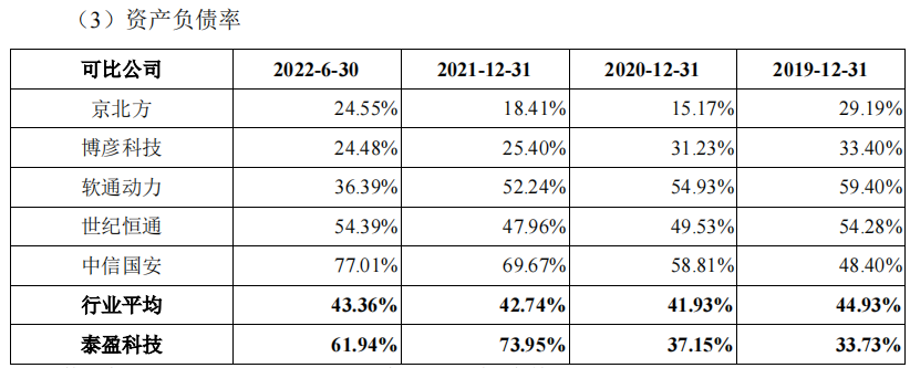 且泰盈科技的资产负债率迅速升高,报告期内,分别为33.73%、37.15%、73.95%和61.94%,远高于同行水平,行业平均为40%左右。