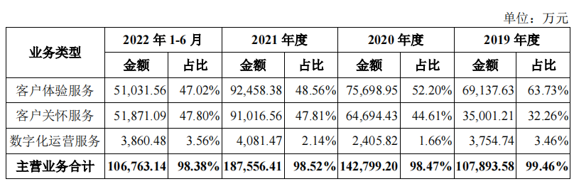 这两项业务构成了泰盈科技的主要营收,《招股书》显示,2019年-2021年、2022年1-6月(下称“报告期”),“客户体验服务”和“客户关怀服务”占到其主营业务的95.99%、96.81%、96.37%和94.82%。