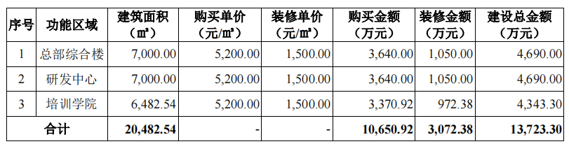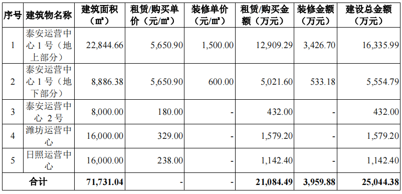 其中运营中心建设项目包括泰安运营中心、潍坊运营中心、日照运营中心等四个运营中心,1个为购买,3个为租赁。购买的泰安运营中心包括购买、装修在内,需要花费2.19亿元。总部及研发中心的2亿金额中,1.37亿元用于购买、装修总部综合楼、研发中心和培训学院。