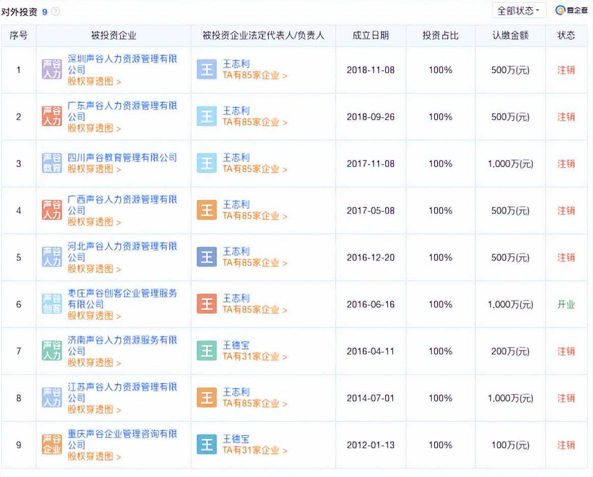 不过,几家声谷公司均已被注销,《招股书》显示,报告期内,泰盈科技28家关联公司注销,包括位于重庆、烟台的两所职业培训学校,还有各地的声谷人力资源管理有限公司,如发生关联交易的江苏声谷、深圳声谷、济南声谷等。