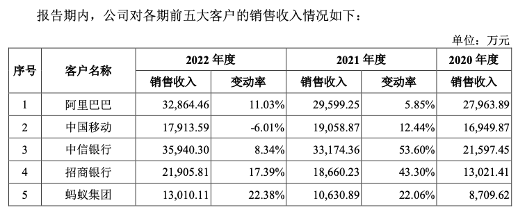 中信银行、招商银行、水滴互助集团、阿里巴巴、蚂蚁、字节跳动、美团、京东、顺丰、滴滴、中国移动、中国电信等均为泰盈科技的客户。其中阿里巴巴在2019年、2020年、2022年1-6月,均为第一大客户,销售占比在15.19%-22.36%之间。