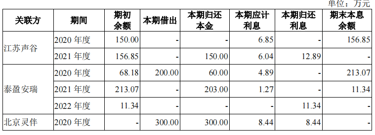 江苏声谷还因资金周转需求,向泰盈科技累计拆借资金150万元,重庆声谷因资金周转需求,曾向公司子公司重庆先特拆借资金,累计拆借金额为137.52万元。2018年、2020年,控股股东泰盈安瑞分别向公司拆借资金63万元及200万元。目前,上述欠款已全部归还。