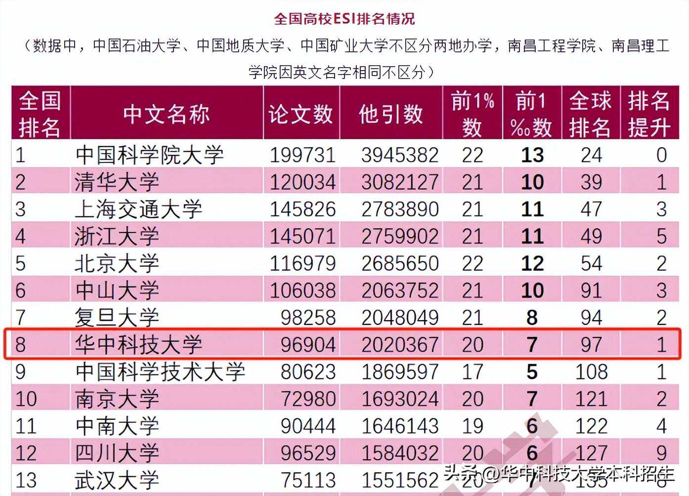 在科睿唯安最新公布的ESI从2013年1月1日到2023年12月31日的统计数据中,华中科技大学以20个全球前1%学科数、7个全球前1‰学科数,位列全国第8位,全球第97位,排名提升1个位次;