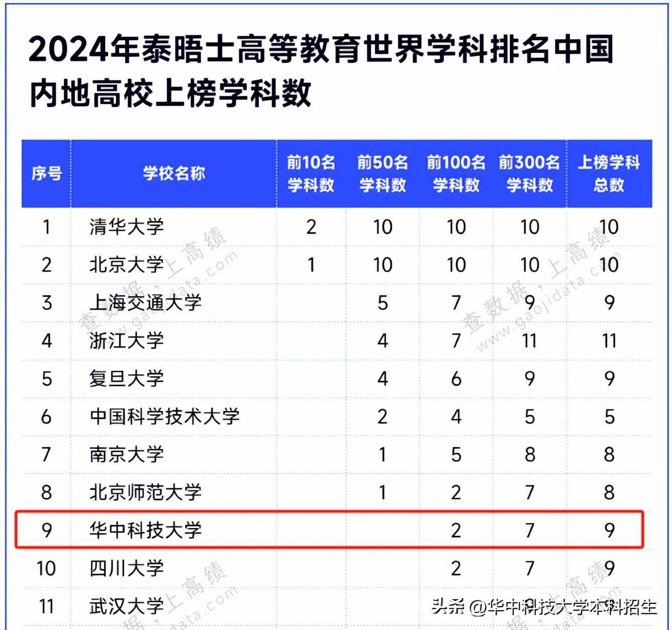在2024年泰晤士高等教育世界学科排名中,华中科技大学共有9个学科上榜,其中7个学科位列全球前300,2个学科跃居全球百强;