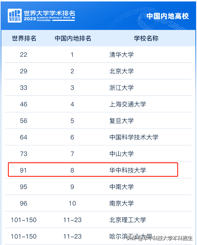 在软科发布的“2023世界大学学术排名”中,华中科技大学位列全国内地高校第8名,世界排名第91名;