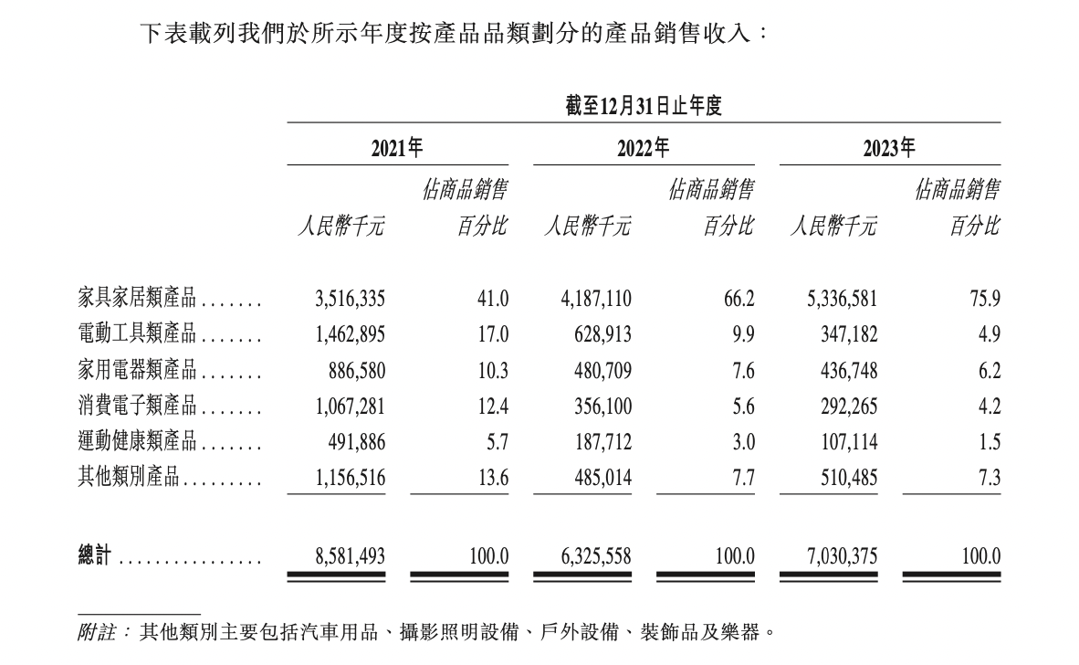 于2021年、2022年及2023年,公司销售家具家居类产品的收入分别为35.16亿元、41.87亿元及53.37亿元,分别占同年商品销售收入的41.0%、66.2%及75.9%。