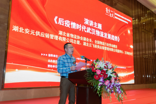 湖北省物流协会副会长、全国物流行业劳动模范、湖北安元供应链管理有限公司总裁、湖北云飞梭供应链管理有限公司董事长、王海波先生发表主题演讲——后疫情时代武汉物流发展趋势。