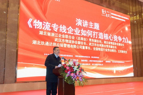 湖北省浙江企业联合会(总商会)常务副会长、湖北省物流协会副会长、武汉市物流协会副会长、武汉市台州商会常务副会长、湖北玖通达供应链管理有限公司董事长、全国物流行业劳动模范、王其耿先生发表主题演讲——物流专线企业如何打造核心竞争力