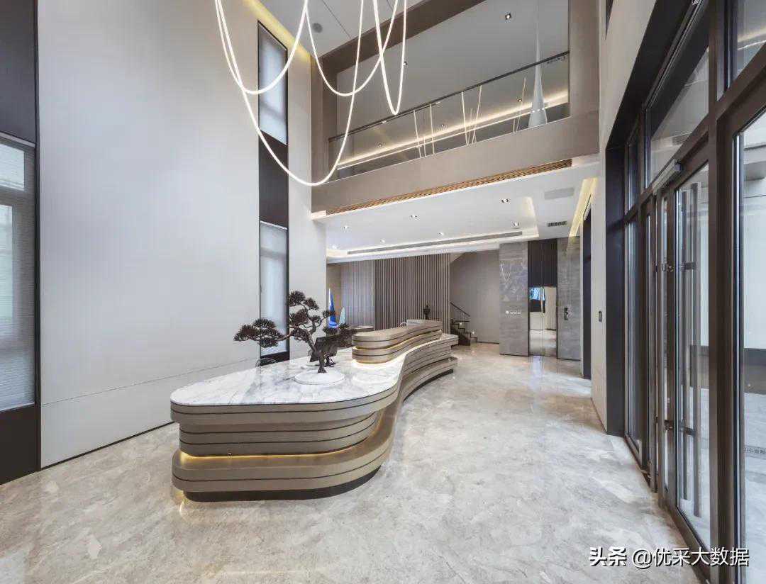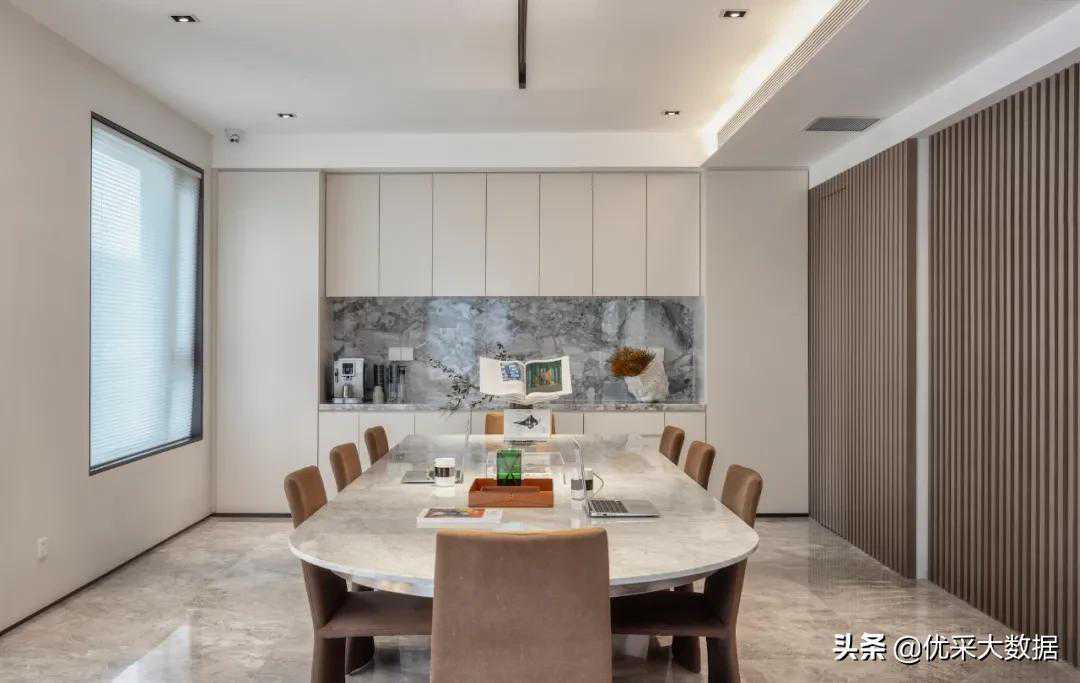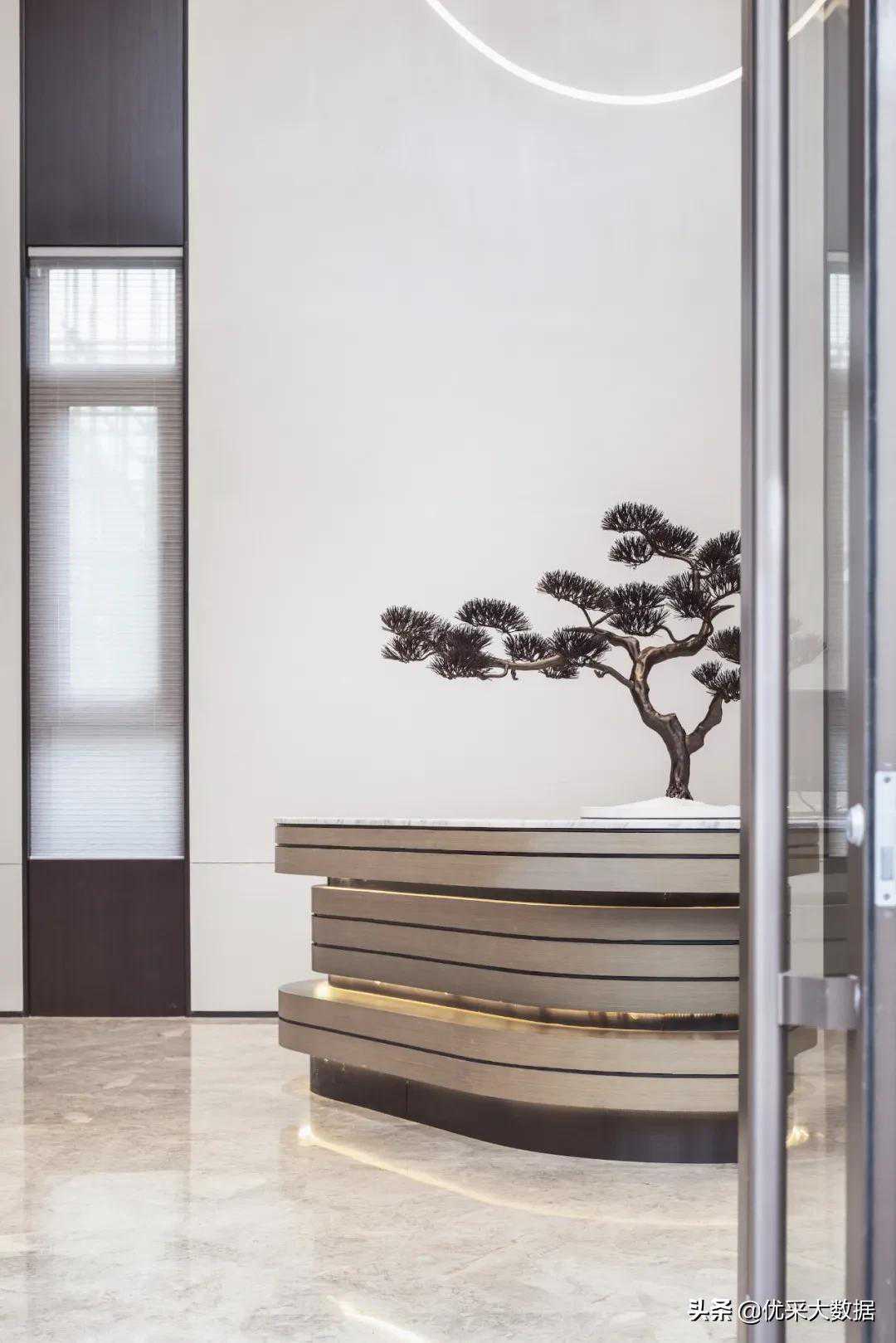 环顾左右,时间的厚度消失在景深之中,设计师将建筑外观与室内空间有机结合,室内空间被流畅的动线包裹着,像一位温润如玉的谦谦君子。墙上的倒G型灯带明亮舒适,在不喧宾夺主的情况下为视觉观感增添乐趣;背景墙中嵌有一块LED屏幕,企业文化,由此展开。