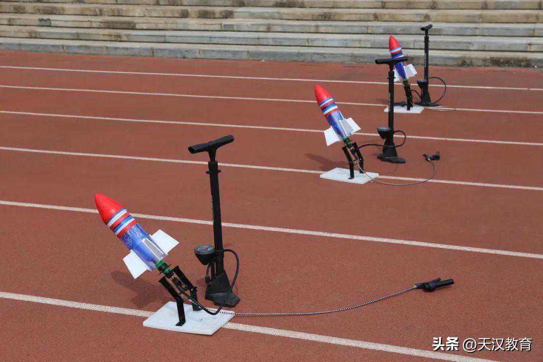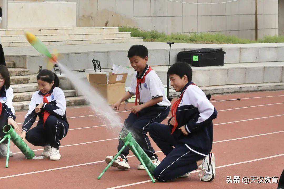 在海葵老师的指导下,孩子们往自制的水火箭装上自来水,把水火箭放在固定的支架上,用打气筒快速打气。“嘭!”伴随着一声声巨响,水火箭在高压气体的反冲力作用下画出一道道优美的弧线,依次冲向高空,飞出几十米远,赢得围观孩子们的阵阵喝彩!