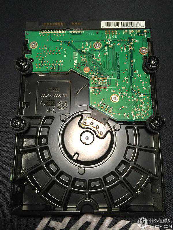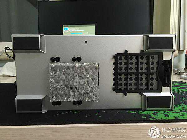 底部。前面有防尘网的地方是电源的进风,防尘网是免工具抽拉式的,清理方便好评。四个角都是实实在在的铝合金,而且贴了2mm的软垫也好评。中间那块补丁。。。呃,是我贴上去的隔热棉,希望靠它顶住底板减少上面的机械硬盘造成的共振的(最后也是然并卵),大家忽略吧。那4个孔是3.5寸硬盘卡扣的固定孔: