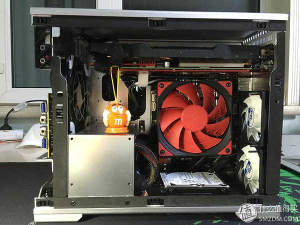 然后就开始装机吧。这个箱子确实挺好装的,装机顺序就是:电源进机箱-》内存、cpu、mSATA硬盘先装上主板-》主板IO挡板上机箱-》主板上机箱-》装上两个后置风扇-》接好各种电源IO开关线-》显卡进机箱上主板接上显卡电源线-》装上CPU散热器-》接上额外的硬盘-》完工!