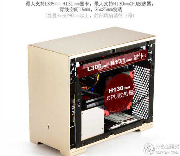 官方对于CPU散热及显卡尺寸支持的说明。CPU支持130mm高,基本就是采融B48之类的小塔或者下压。显卡限高131mm。。。什么概念呢?就是刚好这块耕升GTX960这么高。后面装机章节上图: