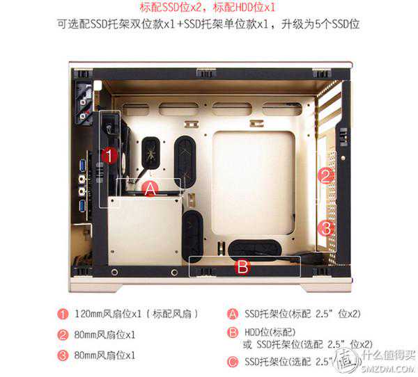 官方对于风扇和硬盘位的描述,然而它没有告诉你B位放3.5寸盘的话会与3位的8cm散热风扇冲突:
