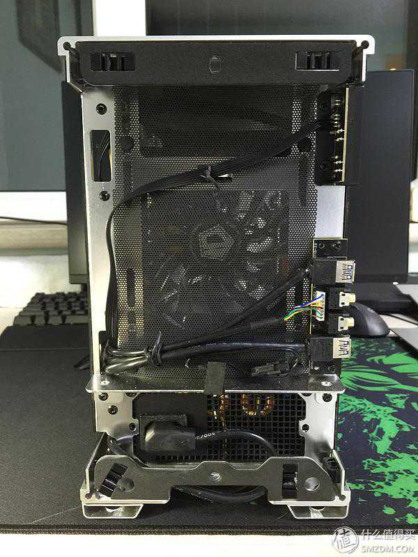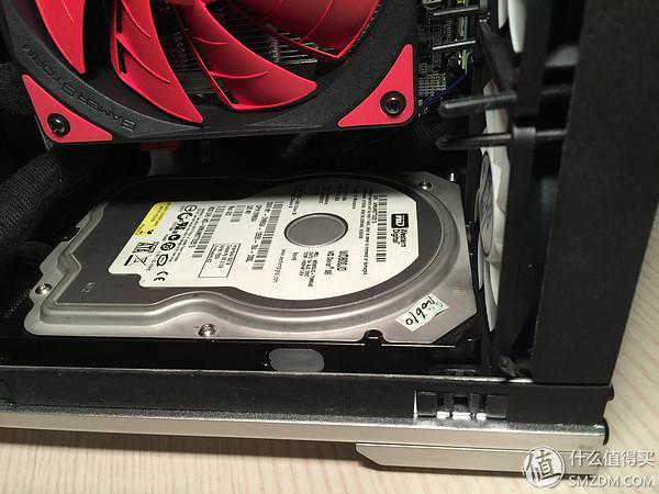 从背面看是这样的,没法把硬盘往后(朝风扇方向)推过去固定了。所以也不是完全冲突吧——3.5寸盘依然可以放进去,但是没法按原来的方式固定了,只能是放在底板上或者想别的方式固定: