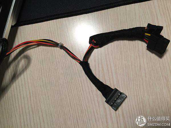 换个角度来一张。注意白色的那个4线接头,那是我把电源原配的风扇也换掉了,换成一个4针PWM风扇接到主板上调速了,后面再细说。硬盘数据线建议换成细一点,否则真不好接: