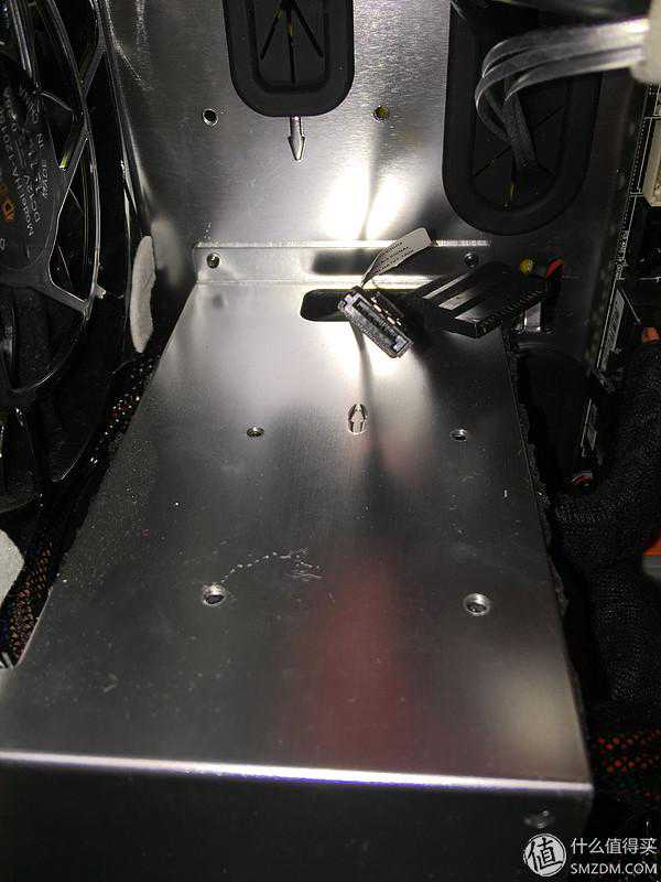 另外一组硬盘电源/数据线从电源挡板这里穿进来。这里是机箱默认的2.5寸硬盘位,但是这里只适合放SSD,放机械硬盘的话会导致比较大的共振,所以后来我把机械硬盘挪到地板上去了: