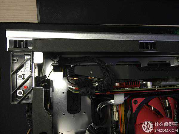 显卡电源线我选择了从上方走,这样的话,侧板一盖,就看不见显卡电源线了哈,我太机智了。显卡尾部包的那点胶布是因为那里有个灯特别刺眼,挡一挡: