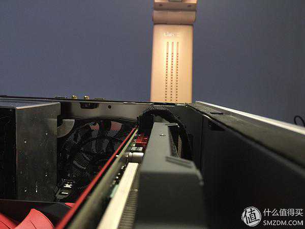 前面说过这个机箱对显卡高度有要求,我们来看看是咋回事。见下图,我这块显卡接上电源线后,使劲把电源接口处弯了弯,最终是将将好,电源线离侧板大概1mm。再高的显卡肯定是放不进去了。官方说的131mm显卡限高实际上还要把电源接口的高度包括进去的: