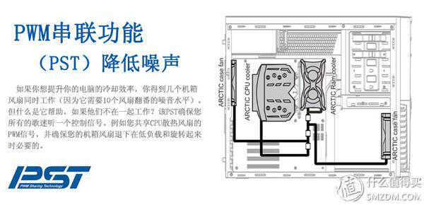 然而我又不走寻常路了。。。还记的我前面买的那两个ARCTICF8PWMPST8cm温控风扇不?按照官网的介绍,带有PST(pwm串联)功能可以玩串串乐: