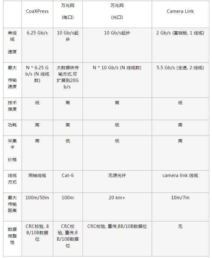 1,我们首先剔除了Cameralink的方案。原因是:目前Camralink方案最大传输速率到5.5Gb/s,稍高于的3.5Gb/s传输速度,还需要配置专门的数据采集卡,成本高,速度一般,先排除。
