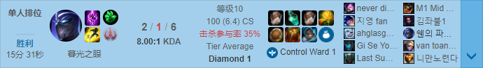 这是来自韩服钻1分段的几局排位赛,这名选手使用了很不常见的中单慎。这名选手的中单慎大部分的对局都是在面对一些中单战士、中单刺客,能起到非常不错的效果,所以中单慎在打一些AD中单是颇有建树的。尤其是刺客英雄讲究的就是对线单杀、支援效率,在这两个方面慎都可以做到让对手无法轻易达成,以此来降低对手的前、中期的作用。而且中单慎的团队效果也非常的明显,接下来笔者将给大家具体解读,如何玩好中单暮光之眼!
