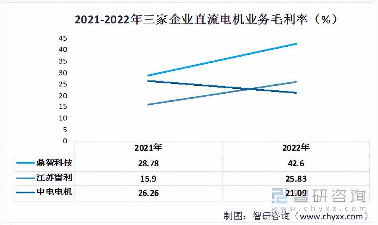 2021年,鼎智科技的直流电机业务毛利率为28.78%,江苏雷利为15.9%,中电电机为26.26%。2022年,鼎智科技的直流电机业务毛利率大幅增加至42.6%,江苏雷利增长为25.83%,中电电机下降为21.09%。
