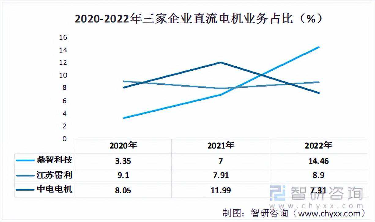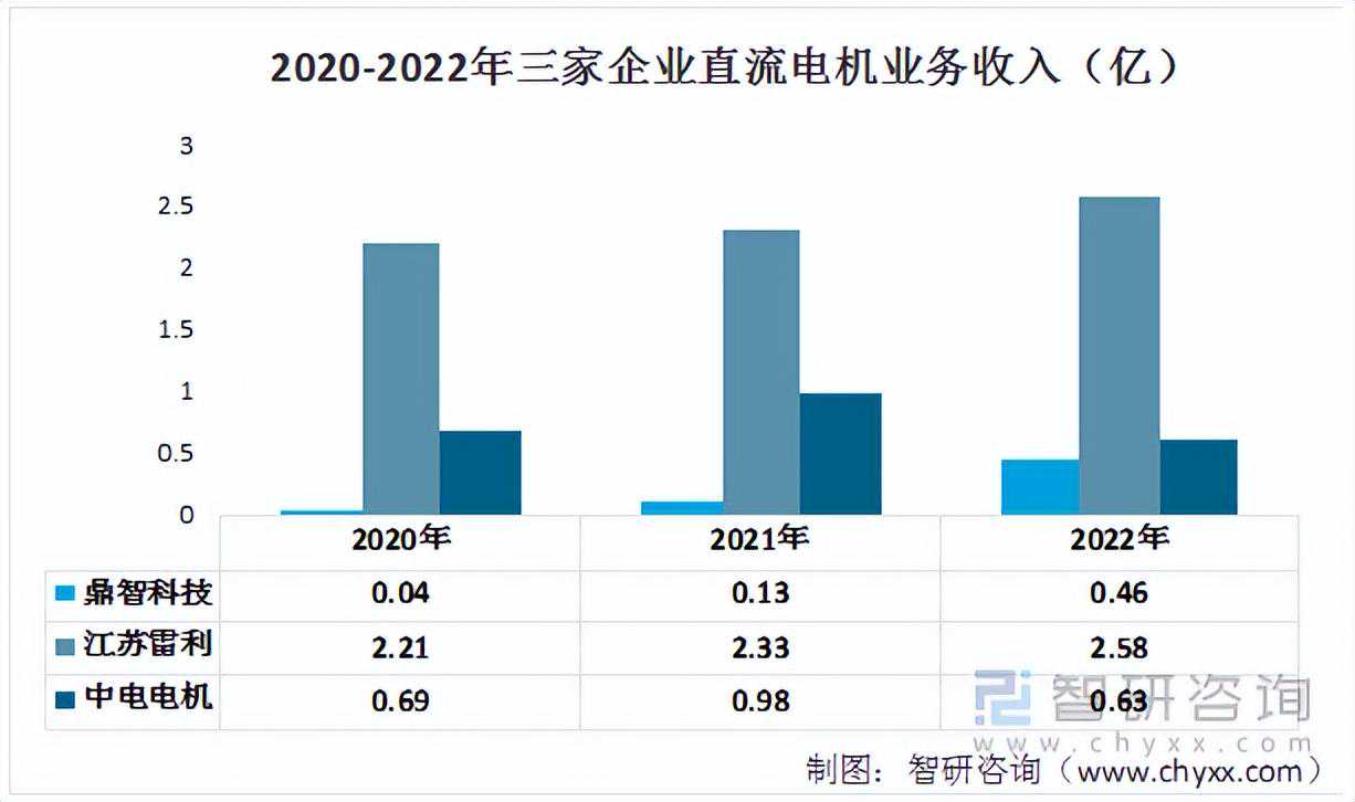 2020年,鼎智科技的直流电机业务收入为0.04亿,江苏雷利为2.21亿,中电电机为0.69亿。2021年,鼎智科技的直流电机业务收入增长至0.13亿,江苏雷利为2.33亿,中电电机为0.98亿。2022年,鼎智科技的直流电机业务收入大幅增加至0.46亿,江苏雷利为2.58亿,中电电机为0.63亿。