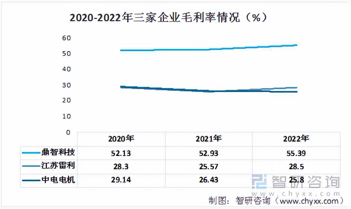 三家企业中鼎智科技的毛利率最高,江苏雷利和中电电机较为接近。2022年鼎智科技、江苏雷利和中电电机的毛利率分别为55.39%、28.5%和25.8%。