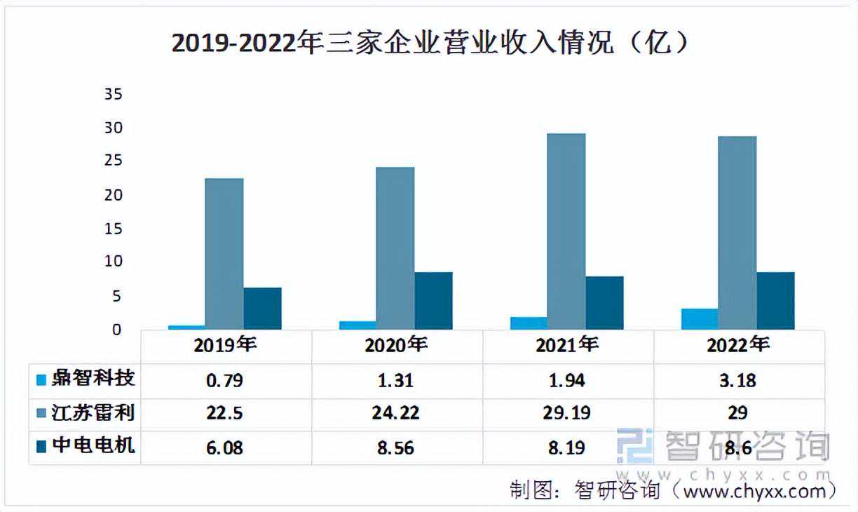 近年来三家企业的营业收入整体均呈现上升的态势。2022年鼎智科技、江苏雷利和中电电机的营业收入分别为3.18亿、29亿和8.6亿。