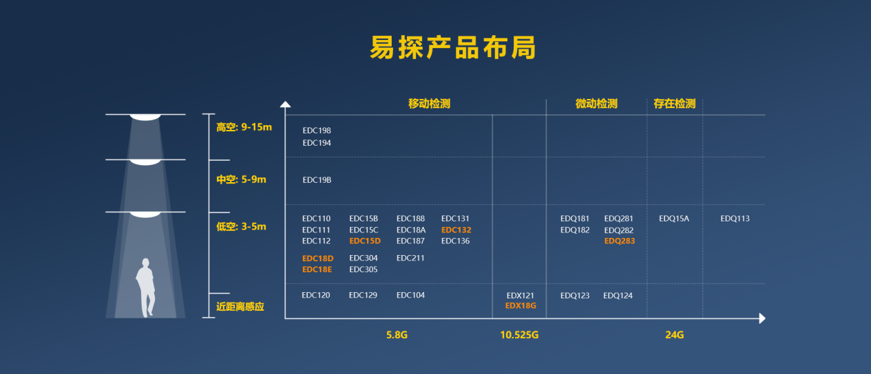 易探科技的产品按照雷达工作频率可分为探测人体走动的EDC(5.8G)系列和探测人体微动的EDQ(24G)系列。近期,易探科技也会推出生命体征探测的EDV(60G)系列,也有只用来弥补探测近距离感应的EDX(10.525G)系列,可实现人体移动检测、微动检测、人体存在及体征检测的功能。
