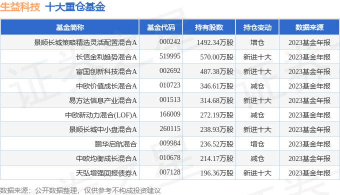重仓生益科技的前十大基金见下表: