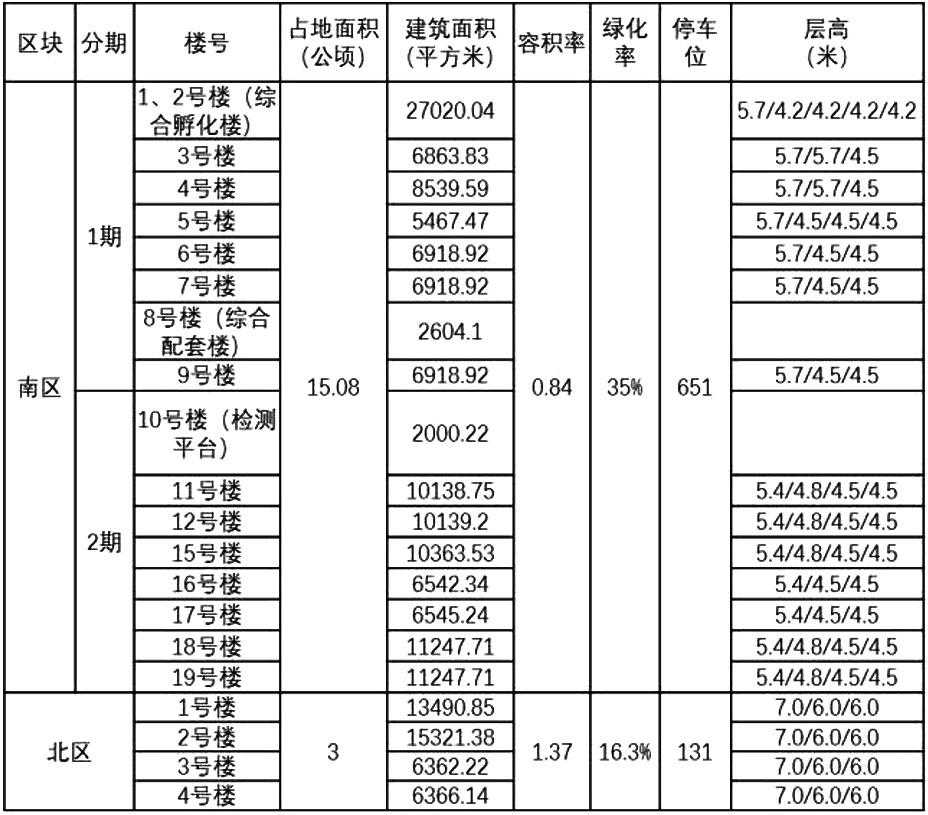 标准研发生产用房等载体面积46万平方米,多为3-4层研发楼宇,南区的首层高度5.4米以上,二层以上高度在4.5米,主要满足科研、孵化和综合服务功能;北区的首层高度7米以上,二层以上高度6米,主要满足研发生产功能。电力配置100瓦/平方米,楼板承重500公斤/平方米。南区1号楼和2号楼为综合孵化楼,也是园区标志性建筑,面积为27000平方米,立面上采用了大面积的穿孔铝板、玻璃和石材相结合的幕墙。