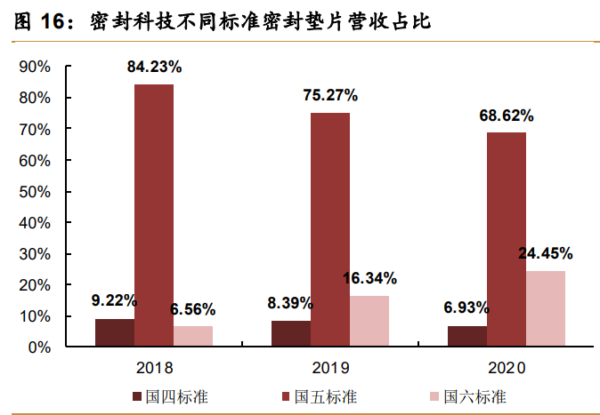 节能减排的深化及发动机排放国五、国六标准的不断迭代,也要求密封制品企业具备快速响应能力。为符合节能减排新标准要求,主机厂在2018-2019年开始逐步量产国六标准发动机,2020年开始陆续批量生产,发动机密封制品和密封材料企业也需要研发新的产品与之配套,这对以公司为代表的具备快速响应需求能力的密封制品企业带来了新的机遇。公司于2019-2020开始持续批量生产国六标准产品,国六标准产品在公司营收结构中的占比从2018年的6.56%提升至2020年的24.45%。