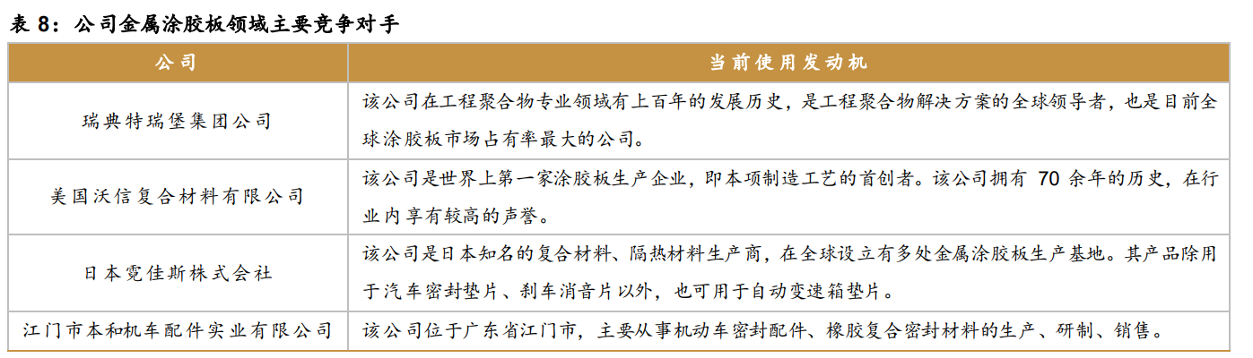 公司在主营密封垫片和密封纤维板的基础上,一方面持续研发上游密封材料,在国内率先建成金属涂胶板卷材自动化生产线,所生产的金属涂胶板是一种高性能复合材料,除可用于制造密封垫片外,还是汽车用刹车消音片的主要原材料;另一方面,公司积极利用下游客户资源,开发了隔热防护罩系列产品。