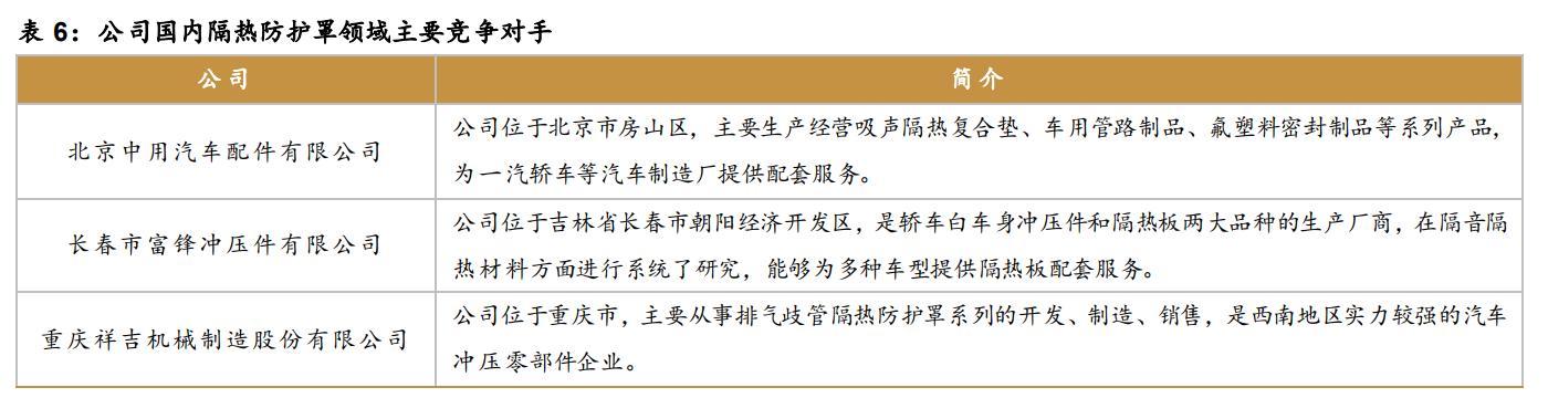 国内隔热防护罩行业主要有三类企业:1)专注于隔热罩产品或其他冲压件的生产企业;2)以密封科技为代表的,在生产其他密封制品的同时也生产隔热防护罩产品并且有一定规模的企业;3)主机厂或整车厂内部自主制造隔热防护罩等零部件的部门,但目前占比相对较低。密封科技在国内隔热防护罩领域的主要竞争对手为:北京中用汽车配件有限公司、长春市富锋冲压件有限公司和重庆祥吉机械制造股份有限公司。