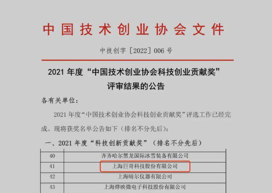 2022年5月7日,中国技术创业协会发布《2021年度“中国技术创业协会科技创业贡献奖”评审结果的公示》,巨哥科技名列其中。