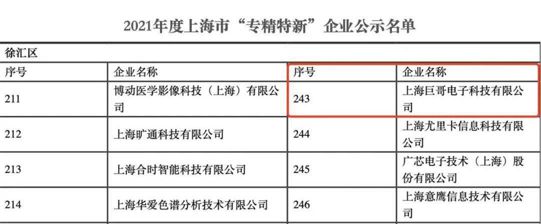 2022年5月19日,上海市经信委将2021年度上海市“专精特新”企业名单予以公示。巨哥科技名列其中,成功入选。