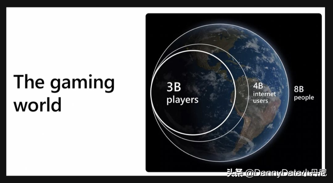 其实就是把地球分成了三个部分的,总人口是8个billion,然后internetusers就是互联网用户是4个billion,真正游戏用户的话是有3个billion,就是30个亿的游戏用户,然后他现在这个XGP的话目前是只有2500万的用户数,所以30亿的游戏用户数减去2500万,其实还是有很大上升空间的!哪怕他只能获取到其中10%的用户,也就是三个亿,其实也是还有十倍的增长空间嘛。所以这也是我觉得为什么微软愿意用很高的溢价的原因,也是丰富自己的这个Xbox,就是XGP的游戏库吧。