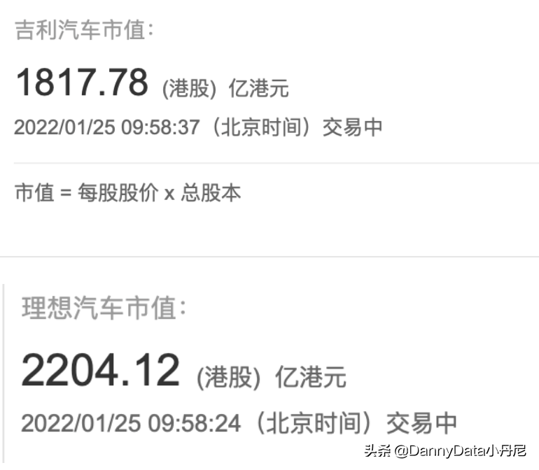 而且还有一点,我做了一个对比,就是目前我看吉利汽车,市值是差不多1800多亿港元,而理想汽车其实都比它的这个市值更高,理想目前的市值差不多2200亿。